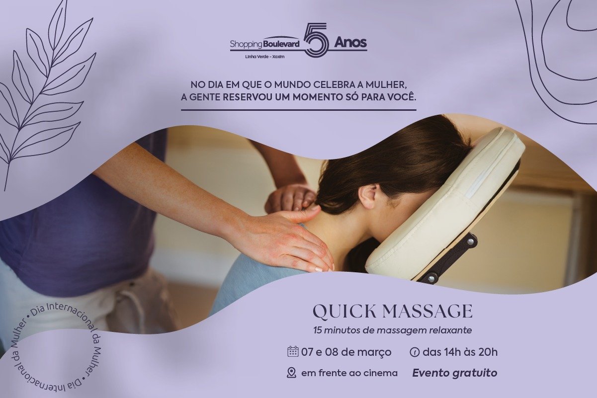 Assessoria – Para celebrar o Dia Internacional da Mulher, o Shopping Boulevard, localizado na Linha Verde, preparou uma programação focada no autocuidado. Nos dias 7 e 8 de março, o estabelecimento oferece ao público sessões gratuitas de quick massage.